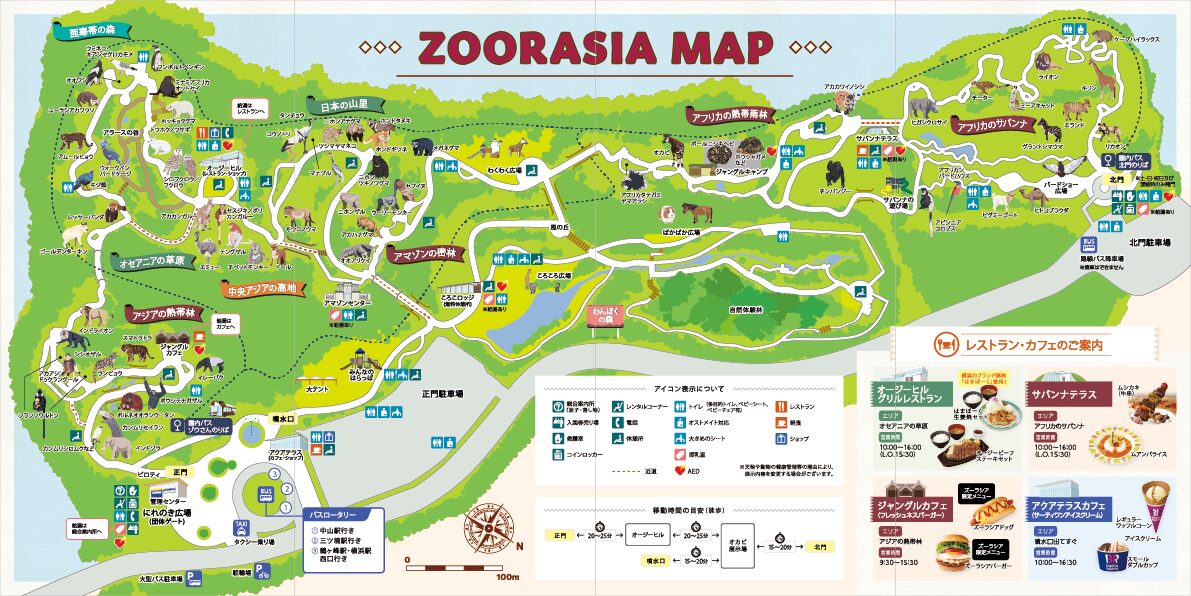 動物だけでなく周囲の植物や雰囲気もそのエリアにあった展示がされており、途中にはレストラン、カフェや広場や遊び場、休憩所が数多く設けられているので、ゆったりと1日楽しむことが出来ます。