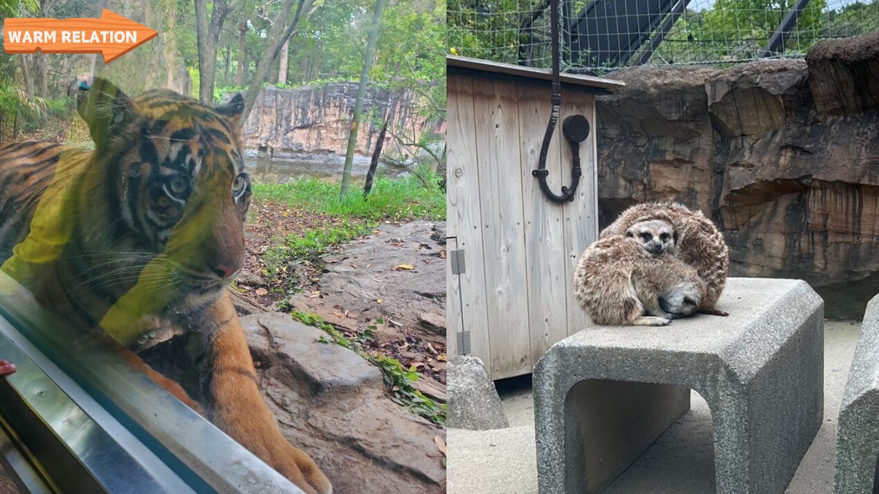 とっても人懐っこいというトラが展示ガラスの目前でくつろいでいたり、少し肌寒い日だったのでミーアキャットがお団子状に暖をとっていたり。