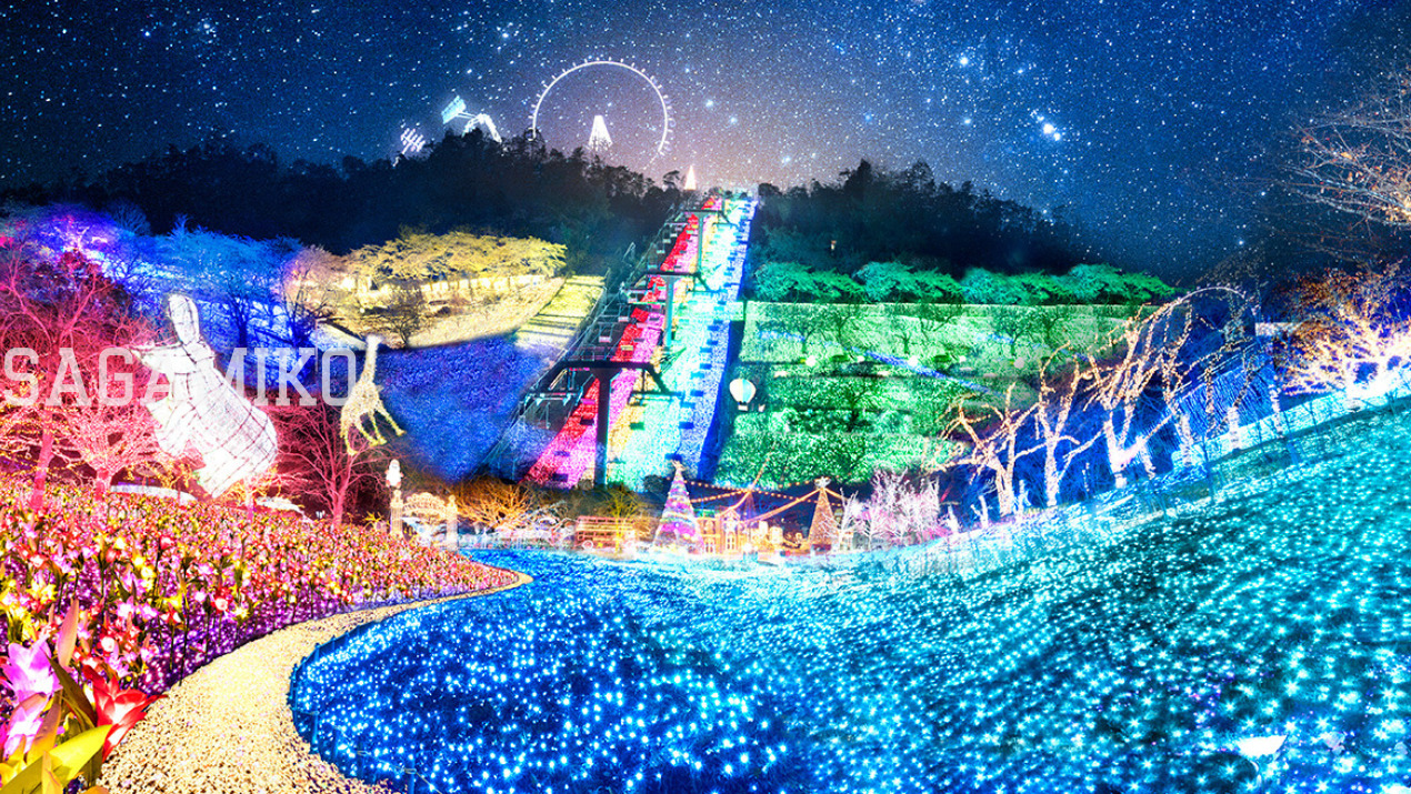 見晴台から見える「光の地上絵」は小人の国の有名なあのシーンを描き、イルミネーションを見る方々も風景の一部となる仕掛けになっています。音楽に合わせてイルミネーションが変化する「光と音のショー」や、暗闇の中に浮かび上がる「光の地上絵」、元祖「虹のトンネル」など、様々な演出を楽しむことができます。