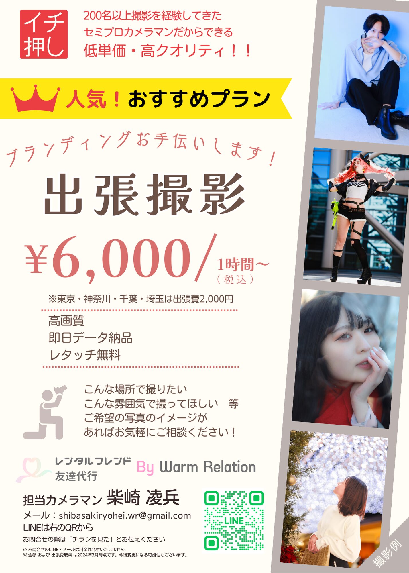 I also work as a photographer, so I can take beautiful photos of you in Japan.