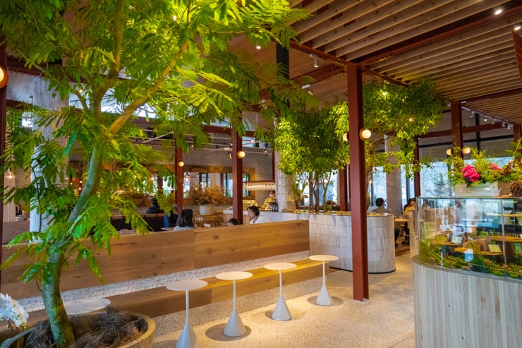 ビル街のすぐ近くにありながら、広々とした芝生に囲まれ爽快感と開放感に満ちた時間を過ごせる人気のお店。