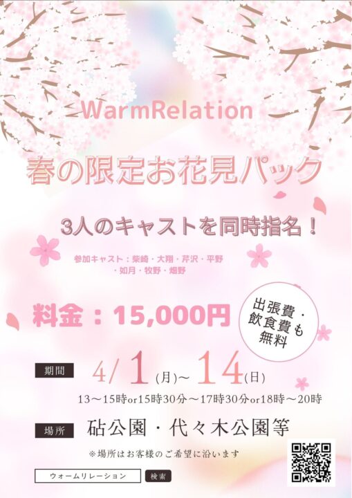 ⇒【お花見イベントなら3人合計2時間15,000円(出張費込み)+飲食等デート代も無料】
