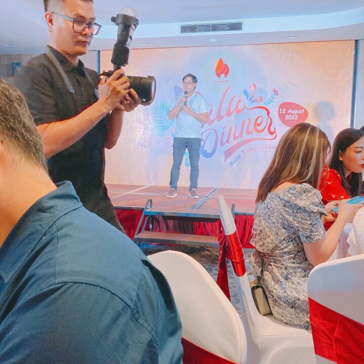 社長が挨拶してる写真。僕も壇上に立って何か喋った記憶があるけど内容は酔ってて覚えてない。