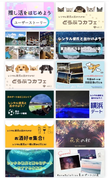 運営スタッフをはじめ、WRデザイナーがお客様やキャストさんから直接デートの取材やリサーチを行って記事にしたブログを一覧として見れるようにバナーでまとめております。