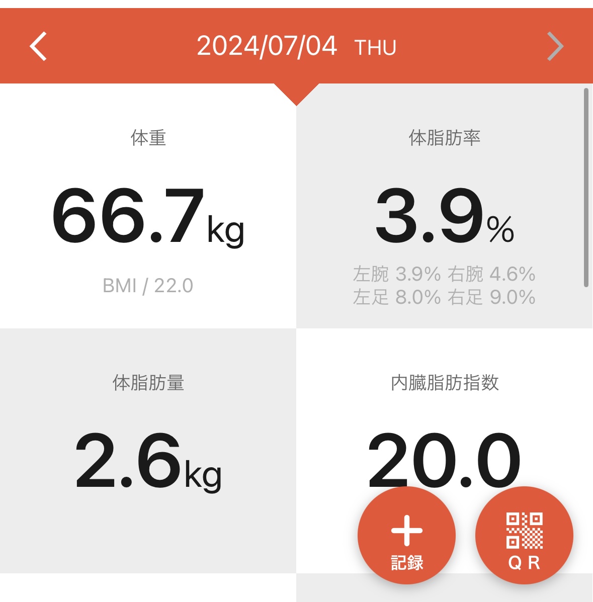 体重は3ヶ月で78kgから66kgまで12kgの減量をして、体脂肪率は3.9%まで落とすことができました。