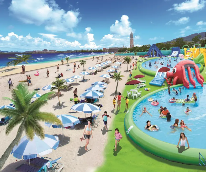 期間限定で、神奈川県真鶴町の岩海岸海水浴場にて海上アスレチックや海の家を完備したウォーターパークを開催されています。