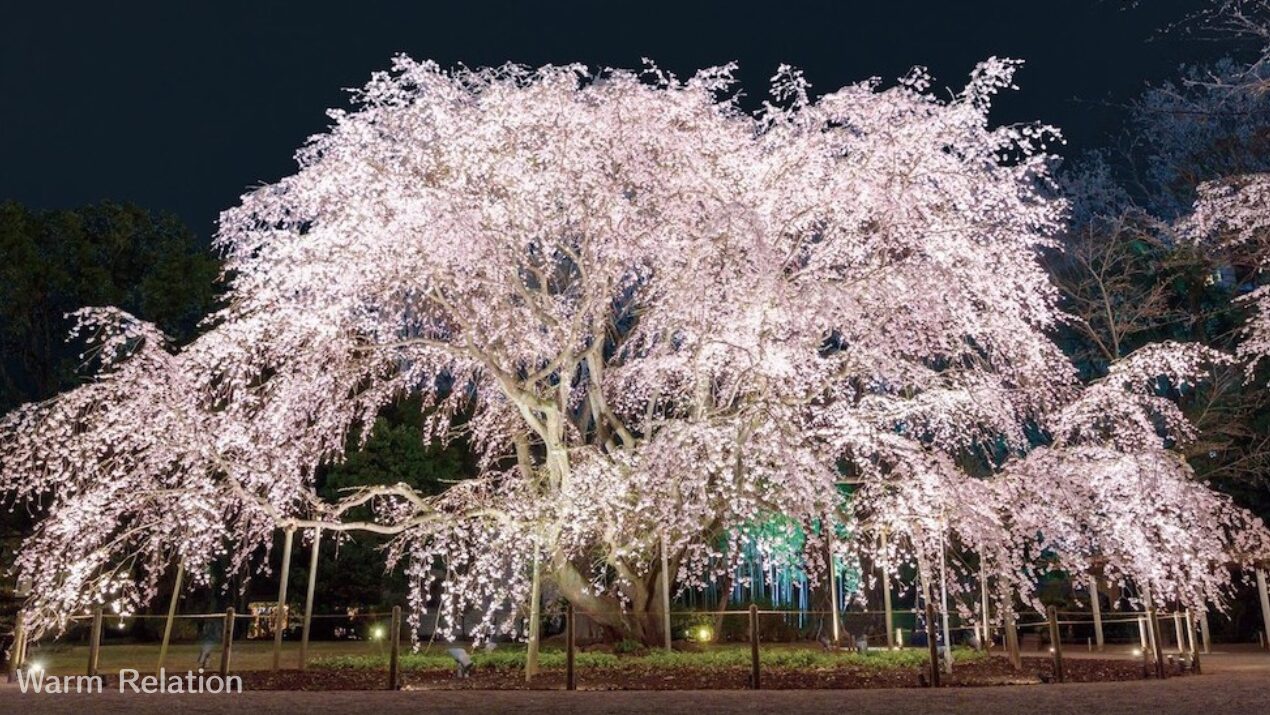 六義園のシンボルともいえるしだれ桜は、高さ約15メートル、幅は20メートルにもおよび、夜空に浮かび上がる姿は見ごたえ十分!