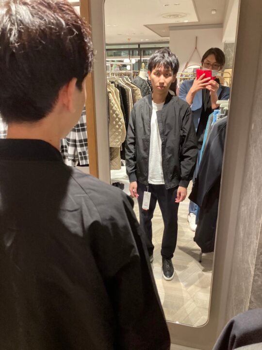 逢坂さんが「回ってみ?」と言って前からも横からも後ろからもサイズ感をチェックしてくれるので、袖の後ろが余っていないかなど、自分では気づけないところまで確認できて大変有難い限りです。
