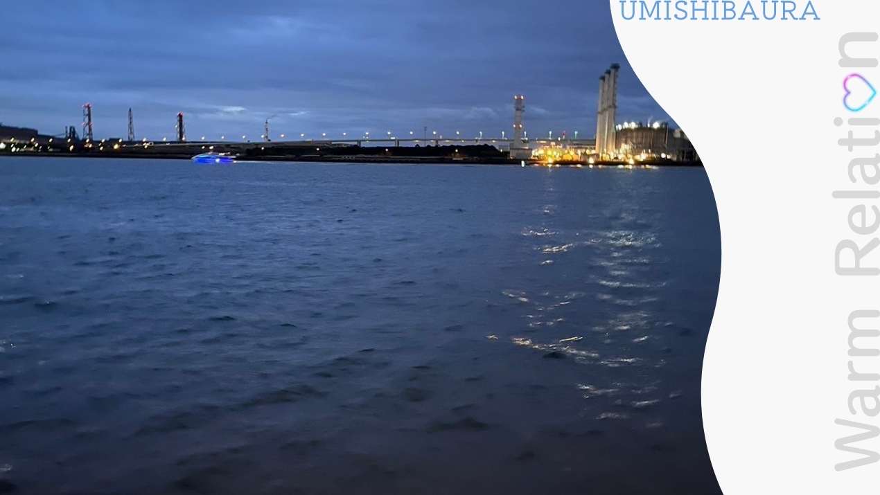 周辺には無機質な工場群が立ち並び、運河の対岸には首都高速湾岸線の鶴見つばさ橋、右手には大黒ふ頭や横浜ベイブリッジ。クルーズ船も海上を往来しています。